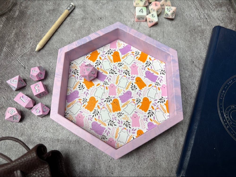 This gorgeous dice rolling tray features a cute and spooky ghost print faux leather lining. The tray itself is made from Jesmonite (stone effect eco-resin) in marbled pastel pink and purple.