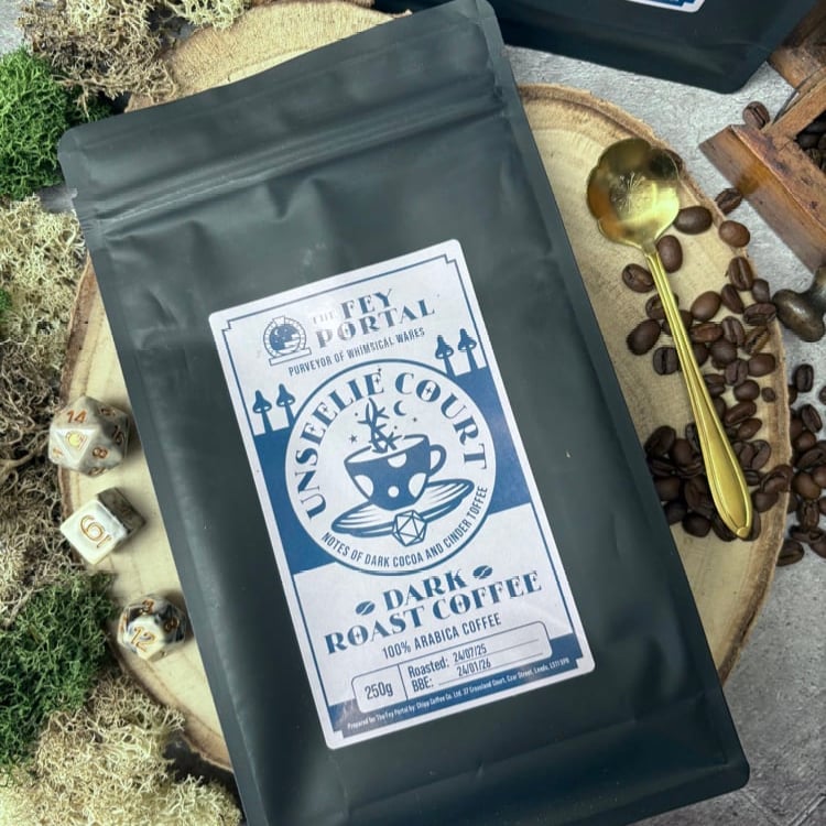 🍄Unseelie Court - a dark roast blend, with deep cocoa notes and a hint of cinder toffee. For those who are more inclined to the darker side and can be found up to mischief in the mossy woods.