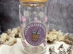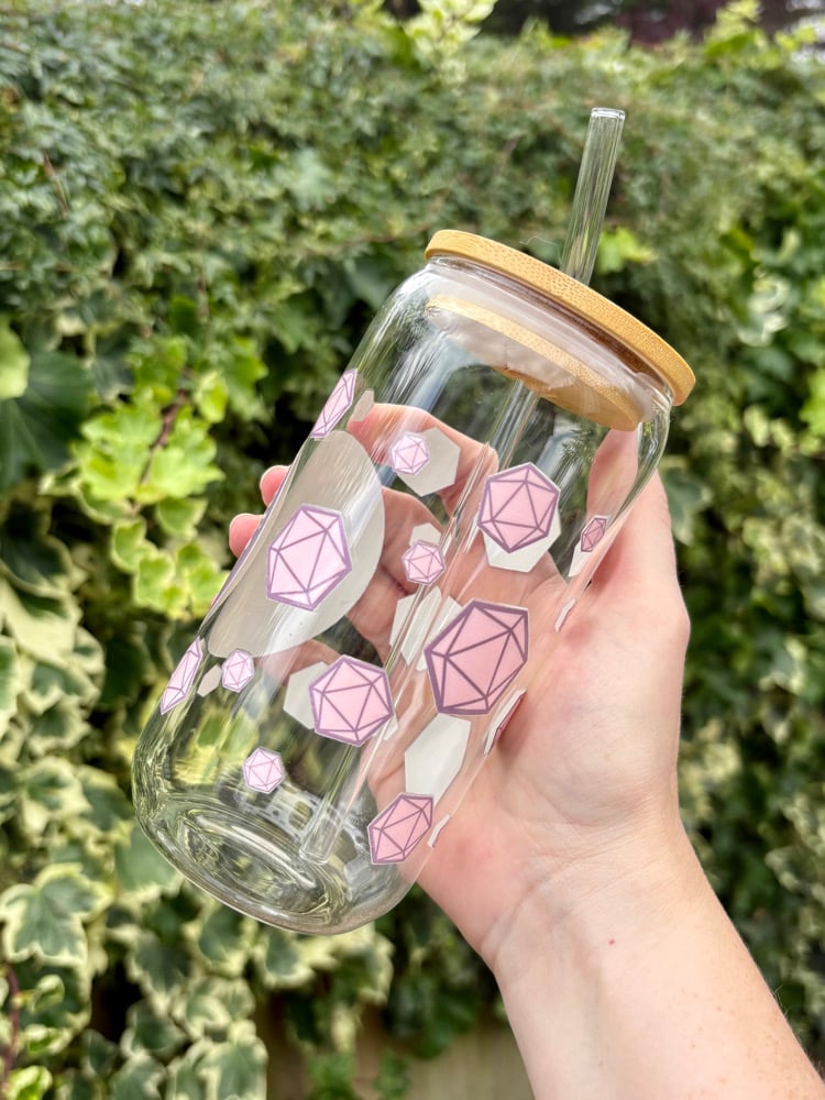 An adorable feywild-themed 16oz iced coffee glass with glass straw and bamboo lid. The design features a fantasy coffee shop-themed logo and cute pink dice.
