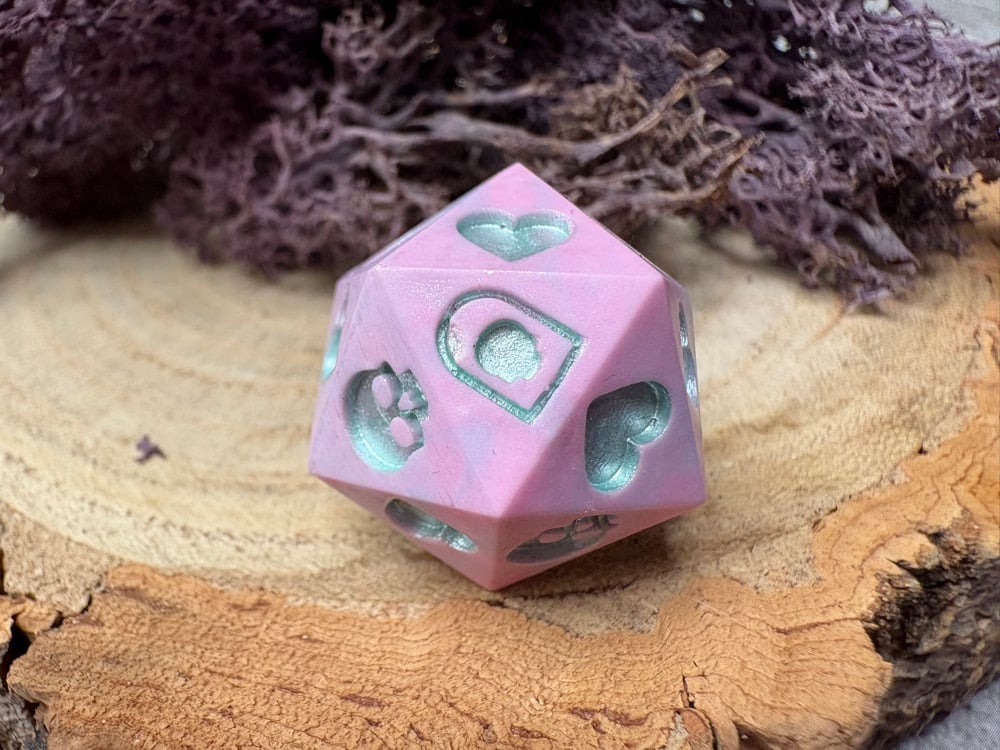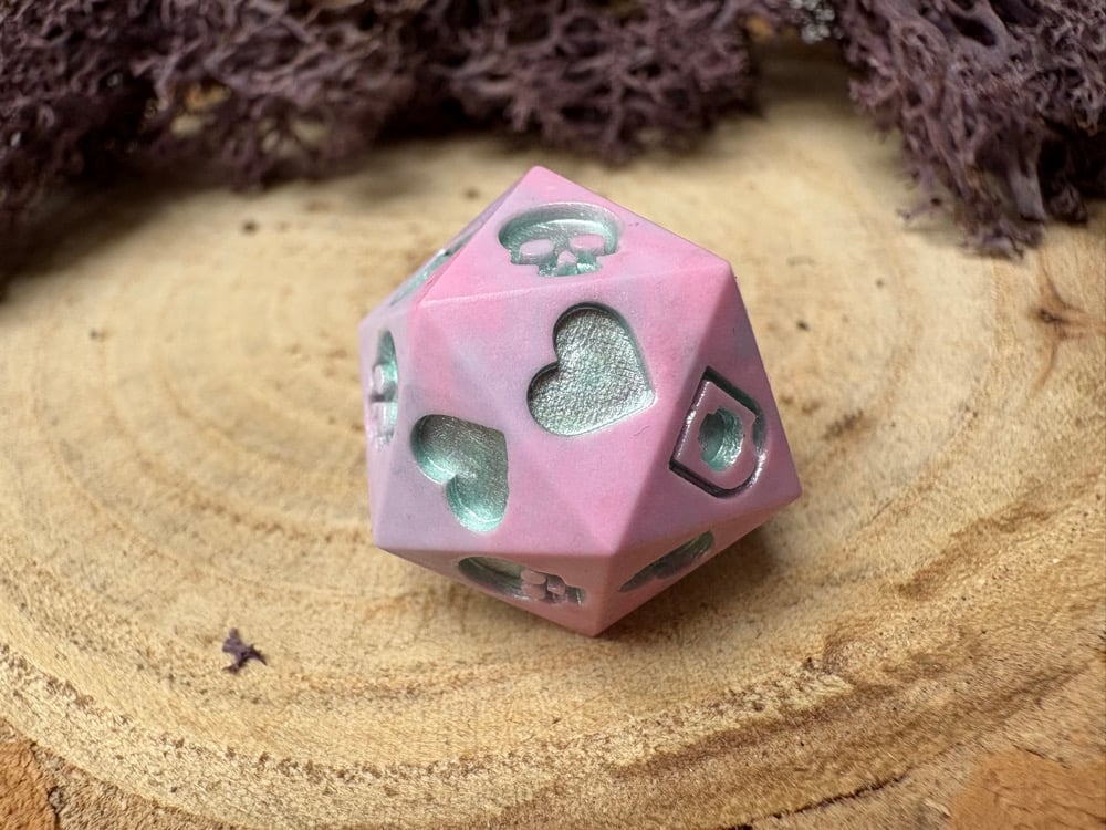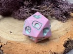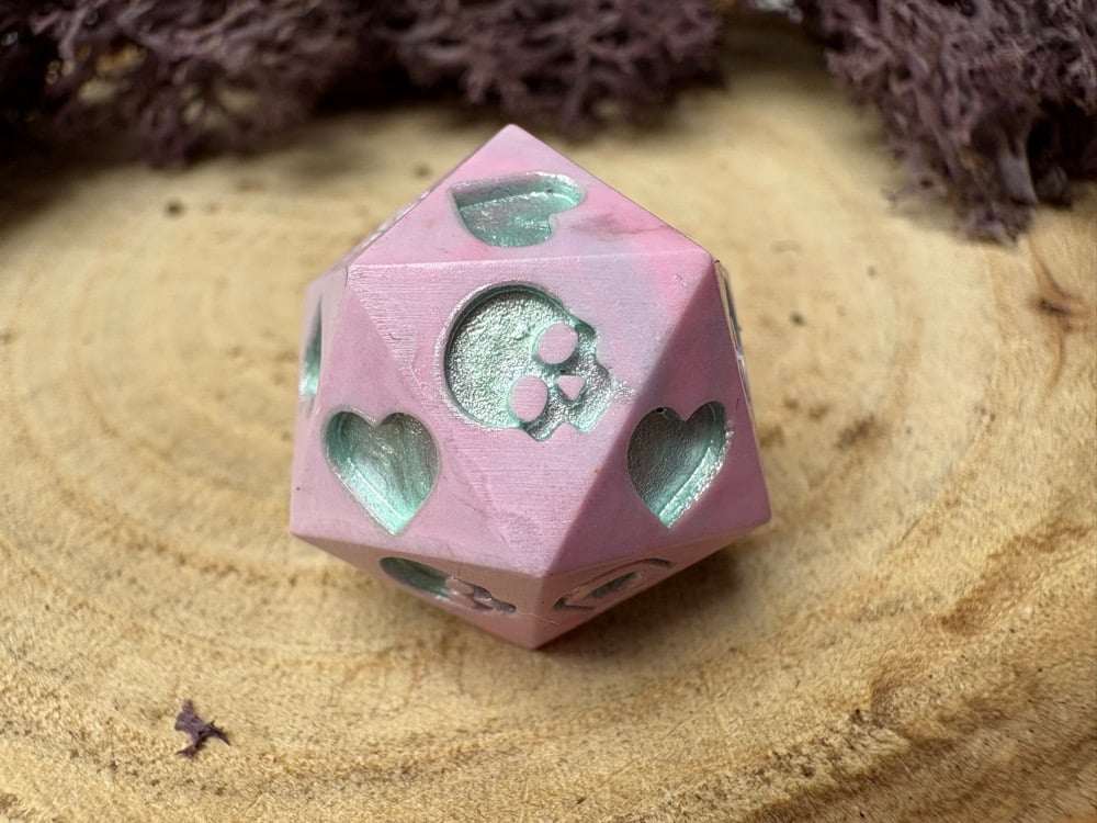 This handmade death save d20 is made from swirls of pastel purple and pink Jesmonite (stone effect eco-resin) with light metallic mint symbols. It's a perfect addition to your Dungeons and Dragons dice collection and a great gift for any player.